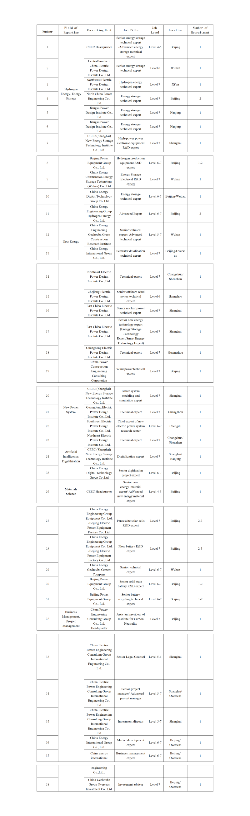 37 | 中國能源建設(shè)集團國際工程有限公司 | 商務(wù)管理專家 | 6級-7級 | 北京/ | 1人 | |